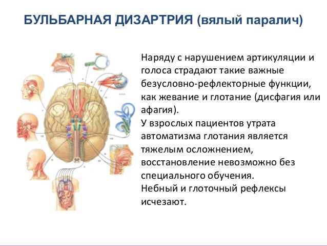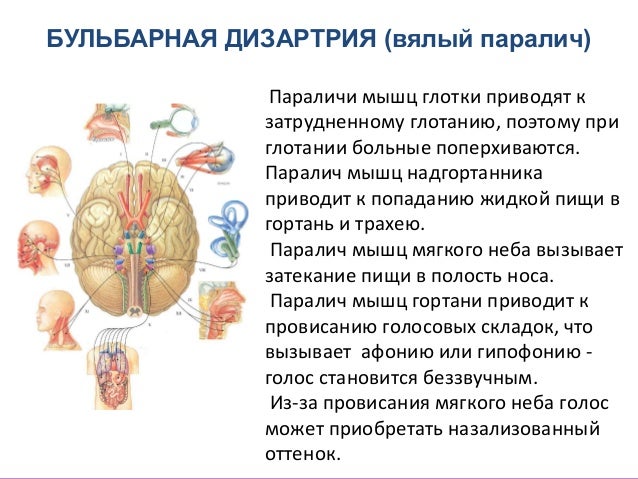 - 15. БУЛЬБАРНАЯ ДИЗАРТРИЯ (вялый паралич) Параличи мышц глотки приводят к затрудненному глотанию, поэтому при глотании больные поперхиваются. Паралич мышц надгортанника приводит к попаданию жидкой пищи в гортань и трахею. Паралич мышц мягкого неба вызывает затекание пищи в полость носа. Паралич мышц гортани приводит к провисанию голосовых складок, что вызывает афонию или гипофонию - голос становится беззвучным. Из-за провисания мягкого неба голос может приобретать назализованный оттенок.