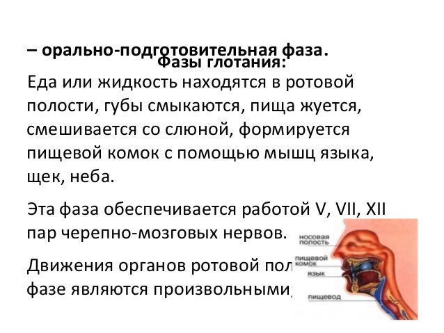 - 17. Фазы глотания: – орально-подготовительная фаза. Еда или жидкость находятся в ротовой полости, губы смыкаются, пища жуется, смешивается со слюной, формируется пищевой комок с помощью мышц языка, щек, неба. Эта фаза обеспечивается работой V, VII, XII пар черепно-мозговых нервов. Движения органов ротовой полости в этой фазе являются произвольными;