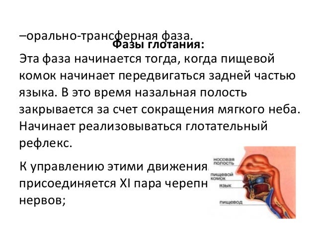 - 18. Фазы глотания: –орально-трансферная фаза. Эта фаза начинается тогда, когда пищевой комок начинает передвигаться задней частью языка. В это время назальная полость закрывается за счет сокращения мягкого неба. Начинает реализовываться глотательный рефлекс. К управлению этими движениями присоединяется XI пара черепно-мозговых нервов;