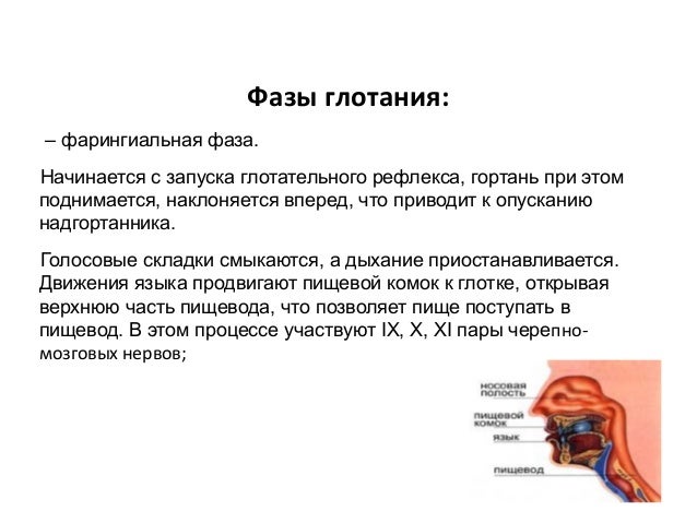 - 19. Фазы глотания: – фарингиальная фаза. Начинается с запуска глотательного рефлекса, гортань при этом поднимается, наклоняется вперед, что приводит к опусканию надгортанника. Голосовые складки смыкаются, а дыхание приостанавливается. Движения языка продвигают пищевой комок к глотке, открывая верхнюю часть пищевода, что позволяет пище поступать в пищевод. В этом процессе участвуют IX, X, XI пары черепно- мозговых нервов;