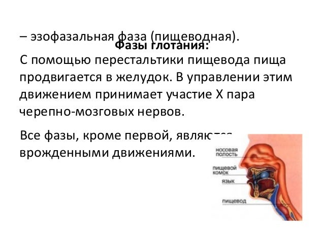 - 20. Фазы глотания: – эзофазальная фаза (пищеводная). С помощью перестальтики пищевода пища продвигается в желудок. В управлении этим движением принимает участие X пара черепно-мозговых нервов. Все фазы, кроме первой, являются врожденными движениями.