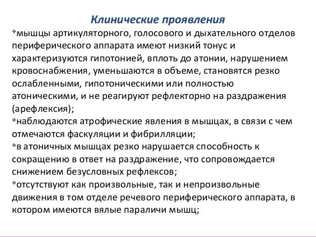 - 22. Клинические проявления v мышцы артикуляторного, голосового и дыхательного отделов периферического аппарата имеют низкий тонус и характеризуются гипотонией, вплоть до атонии, нарушением кровоснабжения, уменьшаются в объеме, становятся резко ослабленными, гипотоническими или полностью атоническими, и не реагируют рефлекторно на раздражения (арефлексия); v наблюдаются атрофические явления в мышцах, в связи с чем отмечаются фаскуляции и фибрилляции; v в атоничных мышцах резко нарушается способность к сокращению в ответ на раздражение, что сопровождается снижением безусловных рефлексов; v отсутствуют как произвольные, так и непроизвольные движения в том отделе речевого периферического аппарата, в котором имеются вялые параличи мышц;
