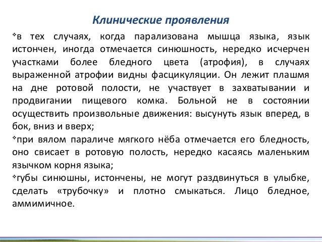- 23. Клинические проявления v в тех случаях, когда парализована мышца языка, язык истончен, иногда отмечается синюшность, нередко исчерчен участками более бледного цвета (атрофия), в случаях выраженной атрофии видны фасцикуляции. Он лежит плашмя на дне ротовой полости, не участвует в захватывании и продвигании пищевого комка. Больной не в состоянии осуществить произвольные движения: высунуть язык вперед, в бок, вниз и вверх; v при вялом параличе мягкого нёба отмечается его бледность, оно свисает в ротовую полость, нередко касаясь маленьким язычком корня языка; v губы синюшны, истончены, не могут раздвинуться в улыбке, сделать «трубочку» и плотно смыкаться. Лицо бледное, аммимичное.