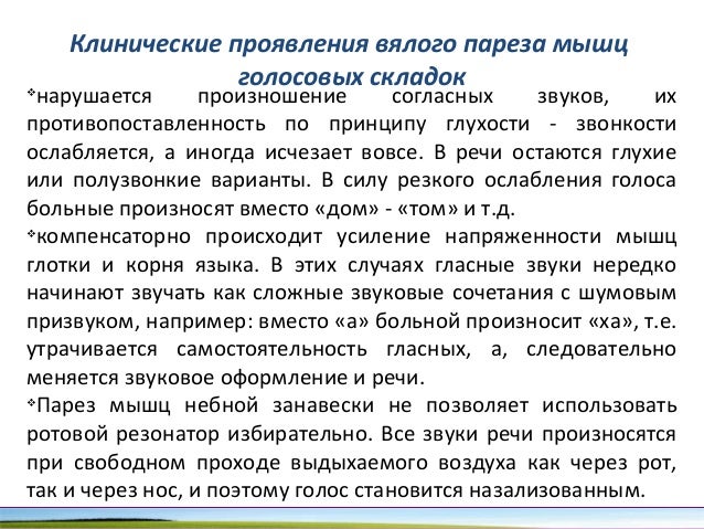 - 25. Клинические проявления вялого пареза мышц голосовых складокv нарушается произношение согласных звуков, их противопоставленность по принципу глухости - звонкости ослабляется, а иногда исчезает вовсе. В речи остаются глухие или полузвонкие варианты. В силу резкого ослабления голоса больные произносят вместо «дом» - «том» и т.д. v компенсаторно происходит усиление напряженности мышц глотки и корня языка. В этих случаях гласные звуки нередко начинают звучать как сложные звуковые сочетания с шумовым призвуком, например: вместо «а» больной произносит «ха», т.е. утрачивается самостоятельность гласных, а, следовательно меняется звуковое оформление и речи. v Парез мышц небной занавески не позволяет использовать ротовой резонатор избирательно. Все звуки речи произносятся при свободном проходе выдыхаемого воздуха как через рот, так и через нос, и поэтому голос становится назализованным.