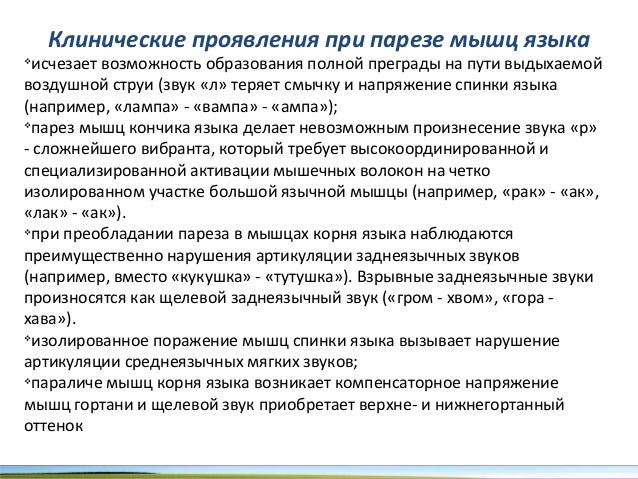 - 27. Клинические проявления при парезе мышц языка v исчезает возможность образования полной преграды на пути выдыхаемой воздушной струи (звук «л» теряет смычку и напряжение спинки языка (например, «лампа» - «вампа» - «ампа»); v парез мышц кончика языка делает невозможным произнесение звука «р» - сложнейшего вибранта, который требует высокоординированной и специализированной активации мышечных волокон на четко изолированном участке большой язычной мышцы (например, «рак» - «ак», «лак» - «ак»). v при преобладании пареза в мышцах корня языка наблюдаются преимущественно нарушения артикуляции заднеязычных звуков (например, вместо «кукушка» - «тутушка»). Взрывные заднеязычные звуки произносятся как щелевой заднеязычный звук («гром - хвом», «гора - хава»). v изолированное поражение мышц спинки языка вызывает нарушение артикуляции среднеязычных мягких звуков; v параличе мышц корня языка возникает компенсаторное напряжение мышц гортани и щелевой звук приобретает верхне- и нижнегортанный оттенок