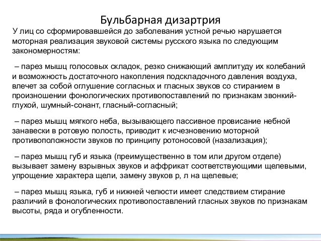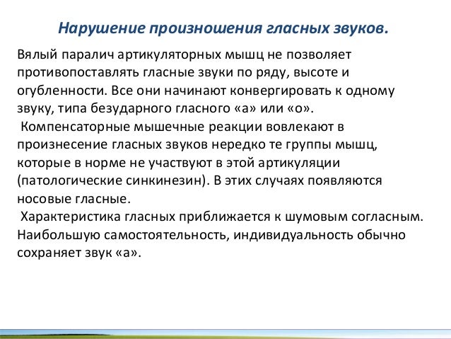 - 29. Нарушение произношения гласных звуков. Вялый паралич артикуляторных мышц не позволяет противопоставлять гласные звуки по ряду, высоте и огубленности. Все они начинают конвергировать к одному звуку, типа безударного гласного «а» или «о». Компенсаторные мышечные реакции вовлекают в произнесение гласных звуков нередко те группы мышц, которые в норме не участвуют в этой артикуляции (патологические синкинезин). В этих случаях появляются носовые гласные. Характеристика гласных приближается к шумовым согласным. Наибольшую самостоятельность, индивидуальность обычно сохраняет звук «а».