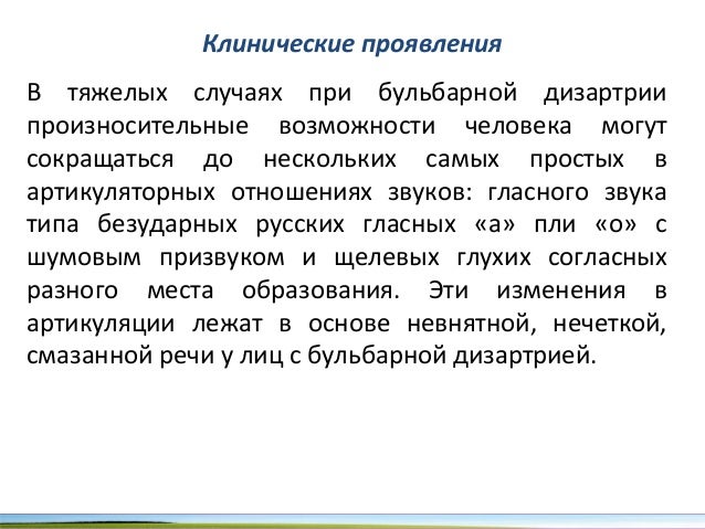 - 30. Клинические проявления В тяжелых случаях при бульбарной дизартрии произносительные возможности человека могут сокращаться до нескольких самых простых в артикуляторных отношениях звуков: гласного звука типа безударных русских гласных «а» пли «о» с шумовым призвуком и щелевых глухих согласных разного места образования. Эти изменения в артикуляции лежат в основе невнятной, нечеткой, смазанной речи у лиц с бульбарной дизартрией.