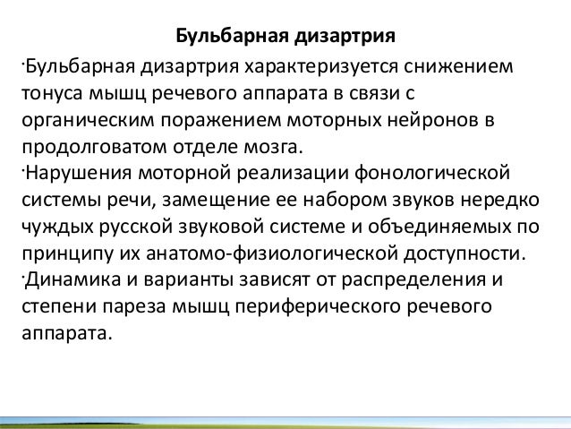 - 31. Бульбарная дизартрия • Бульбарная дизартрия характеризуется снижением тонуса мышц речевого аппарата в связи с органическим поражением моторных нейронов в продолговатом отделе мозга. • Нарушения моторной реализации фонологической системы речи, замещение ее набором звуков нередко чуждых русской звуковой системе и объединяемых по принципу их анатомо-физиологической доступности. • Динамика и варианты зависят от распределения и степени пареза мышц периферического речевого аппарата.
