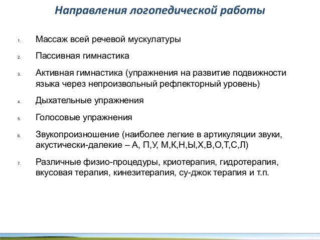 - 33. Направления логопедической работы 1. Массаж всей речевой мускулатуры 2. Пассивная гимнастика 3. Активная гимнастика (упражнения на развитие подвижности языка через непроизвольный рефлекторный уровень) 4. Дыхательные упражнения 5. Голосовые упражнения 6. Звукопроизношение (наиболее легкие в артикуляции звуки, акустически-далекие – А, П,У, М,К,Н,Ы,Х,В,О,Т,С,Л) 7. Различные физио-процедуры, криотерапия, гидротерапия, вкусовая терапия, кинезитерапия, су-джок терапия и т.п.