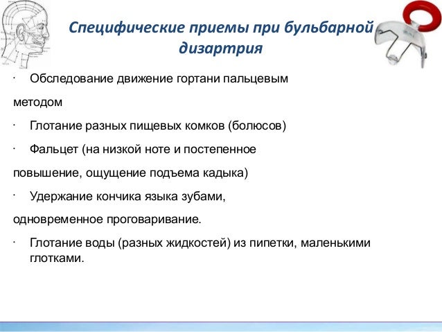 - 34. Специфические приемы при бульбарной дизартрия • Обследование движение гортани пальцевым методом • Глотание разных пищевых комков (болюсов) • Фальцет (на низкой ноте и постепенное повышение, ощущение подъема кадыка) • Удержание кончика языка зубами, одновременное проговаривание. • Глотание воды (разных жидкостей) из пипетки, маленькими глотками.
