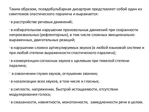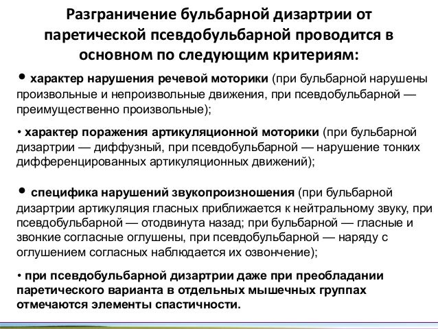 - 35. Разграничение бульбарной дизартрии от паретической псевдобульбарной проводится в основном по следующим критериям: • характер нарушения речевой моторики (при бульбарной нарушены произвольные и непроизвольные движения, при псевдобульбарной — преимущественно произвольные); • характер поражения артикуляционной моторики (при бульбарной дизартрии — диффузный, при псевдобульбарной — нарушение тонких дифференцированных артикуляционных движений); • специфика нарушений звукопроизношения (при бульбарной дизартрии артикуляция гласных приближается к нейтральному звуку, при псевдобульбарной — отодвинута назад; при бульбарной — гласные и звонкие согласные оглушены, при псевдобульбарной — наряду с оглушением согласных наблюдается их озвончение); • при псевдобульбарной дизартрии даже при преобладании паретического варианта в отдельных мышечных группах отмечаются элементы спастичности.
