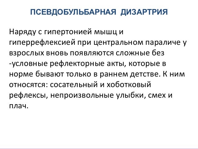 - 38. ПСЕВДОБУЛЬБАРНАЯ ДИЗАРТРИЯ Наряду с гипертонией мышц и гиперрефлексией при центральном параличе у взрослых вновь появляются сложные без -условные рефлекторные акты, которые в норме бывают только в раннем детстве. К ним относятся: сосательный и хоботковый рефлексы, непроизвольные улыбки, смех и плач.