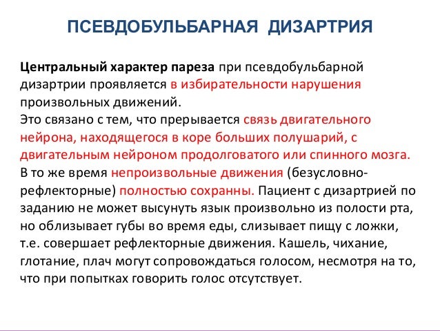 - 39. ПСЕВДОБУЛЬБАРНАЯ ДИЗАРТРИЯ Центральный характер пареза при псевдобульбарной дизартрии проявляется в избирательности нарушения произвольных движений. Это связано с тем, что прерывается связь двигательного нейрона, находящегося в коре больших полушарий, с двигательным нейроном продолговатого или спинного мозга. В то же время непроизвольные движения (безусловно- рефлекторные) полностью сохранны. Пациент с дизартрией по заданию не может высунуть язык произвольно из полости рта, но облизывает губы во время еды, слизывает пищу с ложки, т.е. совершает рефлекторные движения. Кашель, чихание, глотание, плач могут сопровождаться голосом, несмотря на то, что при попытках говорить голос отсутствует.