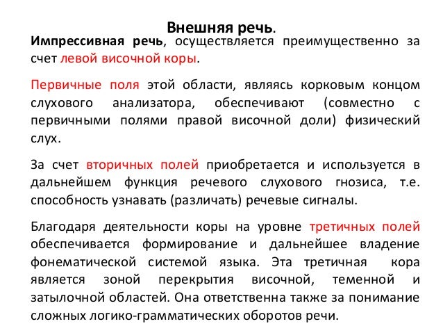 - 4. Внешняя речь. Импрессивная речь, осуществляется преимущественно за счет левой височной коры. Первичные поля этой области, являясь корковым концом слухового анализатора, обеспечивают (совместно с первичными полями правой височной доли) физический слух. За счет вторичных полей приобретается и используется в дальнейшем функция речевого слухового гнозиса, т.е. способность узнавать (различать) речевые сигналы. Благодаря деятельности коры на уровне третичных полей обеспечивается формирование и дальнейшее владение фонематической системой языка. Эта третичная кора является зоной перекрытия височной, теменной и затылочной областей. Она ответственна также за понимание сложных логико-грамматических оборотов речи.