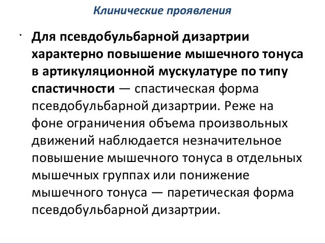 - 40. Клинические проявления • Для псевдобульбарной дизартрии характерно повышение мышечного тонуса в артикуляционной мускулатуре по типу спастичности — спастическая форма псевдобульбарной дизартрии. Реже на фоне ограничения объема произвольных движений наблюдается незначительное повышение мышечного тонуса в отдельных мышечных группах или понижение мышечного тонуса — паретическая форма псевдобульбарной дизартрии.
