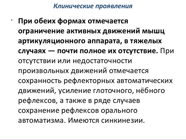 - 41. Клинические проявления • При обеих формах отмечается ограничение активных движений мышц артикуляционного аппарата, в тяжелых случаях — почти полное их отсутствие. При отсутствии или недостаточности произвольных движений отмечается сохранность рефлекторных автоматических движений, усиление глоточного, нёбного рефлексов, а также в ряде случаев сохранение рефлексов орального автоматизма. Имеются синкинезии.