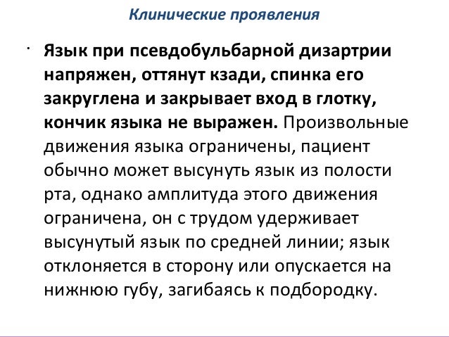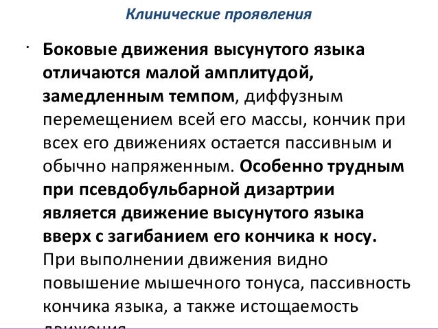 - 42. Клинические проявления • Язык при псевдобульбарной дизартрии напряжен, оттянут кзади, спинка его закруглена и закрывает вход в глотку, кончик языка не выражен. Произвольные движения языка ограничены, пациент обычно может высунуть язык из полости рта, однако амплитуда этого движения ограничена, он с трудом удерживает высунутый язык по средней линии; язык отклоняется в сторону или опускается на нижнюю губу, загибаясь к подбородку.