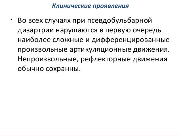 - 44. Клинические проявления • Во всех случаях при псевдобульбарной дизартрии нарушаются в первую очередь наиболее сложные и дифференцированные произвольные артикуляционные движения. Непроизвольные, рефлекторные движения обычно сохранны.