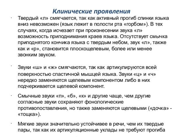 - 46. Клинические проявления • Твердый «л» смягчается, так как активный прогиб спинки языка вниз невозможен (язык лежит в полости рта «горбом»). В тех случаях, когда исчезает при произнесении звука «л» возможность приподнимания краев языка. Отсутствует смычка приподнятого кончика языка с твердым небом, звук «л», также как и «р», становится плоскощелевым, более или менее звонким звуком. • Звуки «ш» и «ж» смягчаются, так как артикулируются всей поверхностью спастичной мышцей языка. Звуки «ц» и «ч» нередко заменяются щелевым компонентом либо в них подчеркивается щелевой компонент. • Смычные звуки «п», «б», «к» и другие чаще, чем другие согласные звуки сохраняют фонологические противопоставления, но также заменяются щелевыми («дочка» - «тощка»). • Мягкие звуки значительно устойчивее в речи, чем их твердые пары, так как их артикуляционные уклады не требуют прогиба