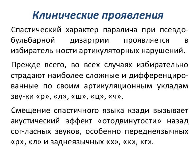 - 47. Клинические проявления Спастический характер паралича при псевдо- бульбарной дизартрии проявляется в избиратель-ности артикуляторных нарушений. Прежде всего, во всех случаях избирательно страдают наиболее сложные и дифференциро- ванные по своим артикуляционным укладам зву-ки «р», «л», «ш», «ц», «ч». Смещение спастичного языка кзади вызывает акустический эффект «отодвинутости» назад сог-ласных звуков, особенно переднеязычных «р», «л» и заднеязычных «х», «к», «г».