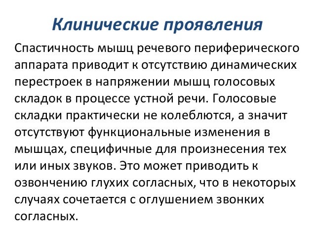 - 48. Клинические проявления Спастичность мышц речевого периферического аппарата приводит к отсутствию динамических перестроек в напряжении мышц голосовых складок в процессе устной речи. Голосовые складки практически не колеблются, а значит отсутствуют функциональные изменения в мышцах, специфичные для произнесения тех или иных звуков. Это может приводить к озвончению глухих согласных, что в некоторых случаях сочетается с оглушением звонких согласных.