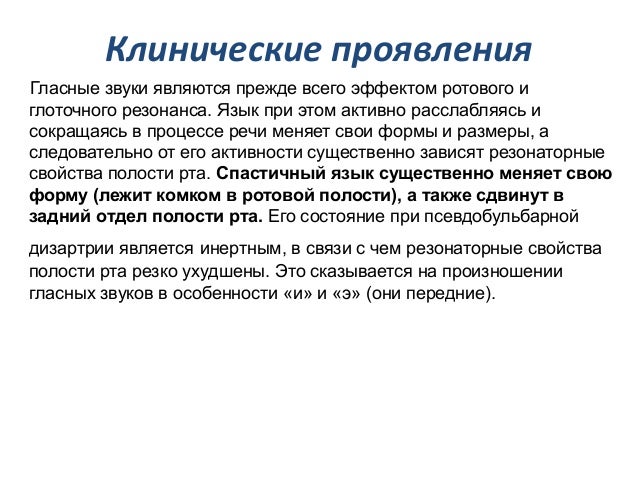 - 49. Клинические проявления Гласные звуки являются прежде всего эффектом ротового и глоточного резонанса. Язык при этом активно расслабляясь и сокращаясь в процессе речи меняет свои формы и размеры, а следовательно от его активности существенно зависят резонаторные свойства полости рта. Спастичный язык существенно меняет свою форму (лежит комком в ротовой полости), а также сдвинут в задний отдел полости рта. Его состояние при псевдобульбарной дизартрии является инертным, в связи с чем резонаторные свойства полости рта резко ухудшены. Это сказывается на произношении гласных звуков в особенности «и» и «э» (они передние).