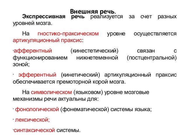 - 5. Внешняя речь. Экспрессивная речь реализуется за счет разных уровней мозга. На гностико-праксическом уровне осуществляется артикуляционный праксис: • афферентный (кинестетический) связан с функционированием нижнетеменной (постцентральной) зоной; • эфферентный (кинетический) артикуляционный праксис обеспечивается премоторной корой мозга. На символическом (языковом) уровне мозговые механизмы речи актуальны для: • фонологической (фонематической) системы языка; • лексической; • синтаксической системы.