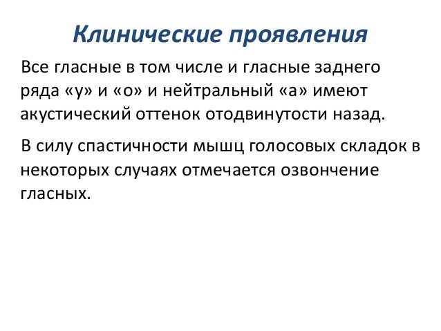 - 50. Клинические проявления Все гласные в том числе и гласные заднего ряда «у» и «о» и нейтральный «а» имеют акустический оттенок отодвинутости назад. В силу спастичности мышц голосовых складок в некоторых случаях отмечается озвончение гласных.
