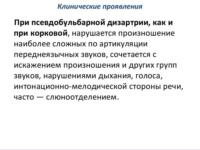 - 45. Клинические проявления • При псевдобульбарной дизартрии определяются характерные нарушения звукопроизношения — избирательные трудности в произношении наиболее сложных и дифференцированных по артикуляционным укладам звуков (р, л, ш, ж, ц, ч). Звук р утрачивает вибрирующий характер, звонкость, часто заменяется щелевым звуком.