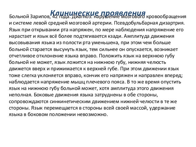 - 52. Клинические проявленияБольной Зарипов, 42 года. Диагноз: нарушение мозгового кровообращения и системе левой средней мозговой артерии. Псевдобульбарная дизартрия. Язык при открывании рта напряжен, по мере наблюдения напряжение его нарастает и язык всё более подтягивается кзади. Амплитуда движения высовывания языка из полости рта уменьшена, при этом чем больше больной старается высунуть язык, тем сильнее он опускается, возникает отчетливое отклонение языка вправо. Положить язык на верхнюю губу больной не может, язык ложится на нижнюю губу, нижняя челюсть движется вверх и прижимается к верхней губе. При этом движении язык тоже слегка уклоняется вправо, кончик его напряжен и направлен вперед; наблюдается напряжение мышц плечевого пояса. В то же время опустить язык на нижнюю губу больной может, хотя амплитуда этого движения неполная. Боковые движения языка затруднены в обе стороны, сопровождаются синкинетическим движением нижней челюсти в те же стороны. Язык перемещается в стороны всей своей массой, удержание языка в боковом положении невозможно.