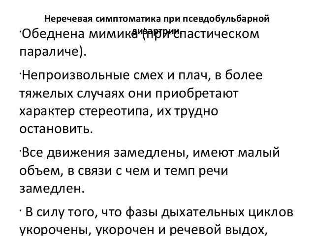 - 54. Неречевая симптоматика при псевдобульбарной дизартрии.• Обеднена мимика (при спастическом параличе). • Непроизвольные смех и плач, в более тяжелых случаях они приобретают характер стереотипа, их трудно остановить. • Все движения замедлены, имеют малый объем, в связи с чем и темп речи замедлен. • В силу того, что фазы дыхательных циклов укорочены, укорочен и речевой выдох,