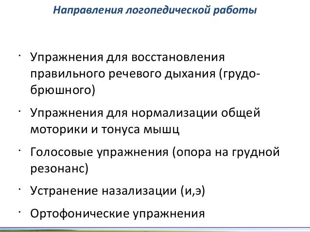 - 56. Направления логопедической работы • Упражнения для восстановления правильного речевого дыхания (грудо- брюшного) • Упражнения для нормализации общей моторики и тонуса мышц • Голосовые упражнения (опора на грудной резонанс) • Устранение назализации (и,э) • Ортофонические упражнения