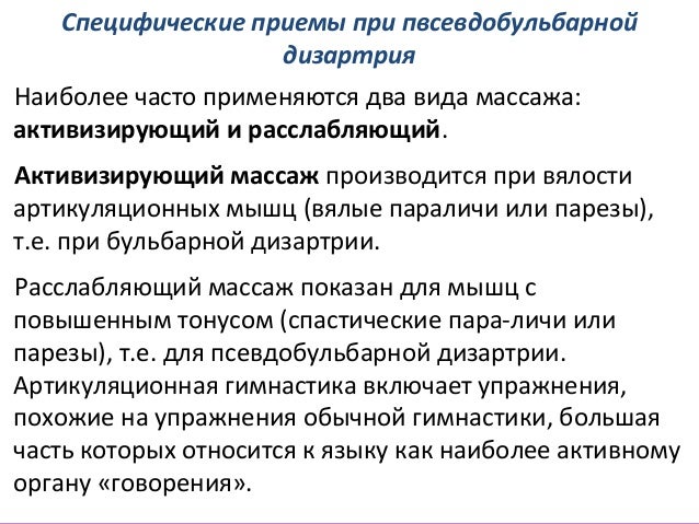 - 57. Специфические приемы при пвсевдобульбарной дизартрия Наиболее часто применяются два вида массажа: активизирующий и расслабляющий. Активизирующий массаж производится при вялости артикуляционных мышц (вялые параличи или парезы), т.е. при бульбарной дизартрии. Расслабляющий массаж показан для мышц с повышенным тонусом (спастические параличи или парезы), т.е. для псевдобульбарной дизартрии. Артикуляционная гимнастика включает упражнения, похожие на упражнения обычной гимнастики, большая часть которых относится к языку как наиболее активному органу «говорения».
