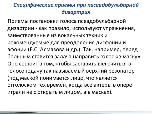- 58. Специфические приемы при пвсевдобульбарной дизартрия Приемы постановки голоса псевдобульбарной дизартрии как правило, используют упражнения, заимствованные из вокальных техник и рекомендуемые для преодоления дисфонии и афонии (Е.С. Алмазова и др.). Так, например, перед больным ставится задача направить голос «в маску». Оно состоит в том, чтобы заставить включиться в голосоподачу так называемый верхний резонатор (под маской понимается лицо, что является отголоском тех времен, когда все актеры в опере играли не с открытым лицом, а в масках).