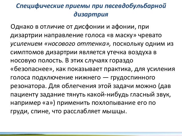 - 59. Специфические приемы при пвсевдобульбарной дизартрия Однако в отличие от дисфонии и афонии, при дизартрии направление голоса «в маску» чревато усилением «носового оттенка», поскольку одним из симптомов дизартрии является утечка воздуха в носовую полость. В этих случаях гораздо «безопаснее», как показывает практика, для усиления голоса подключение нижнего — грудоспинного резонатора. Для облегчения этой задачи можно (дав пациенту задание тянуть какойнибудь гласный звук, например «а») применить похлопывание его по груди, спине, что расслабляет мышцы.