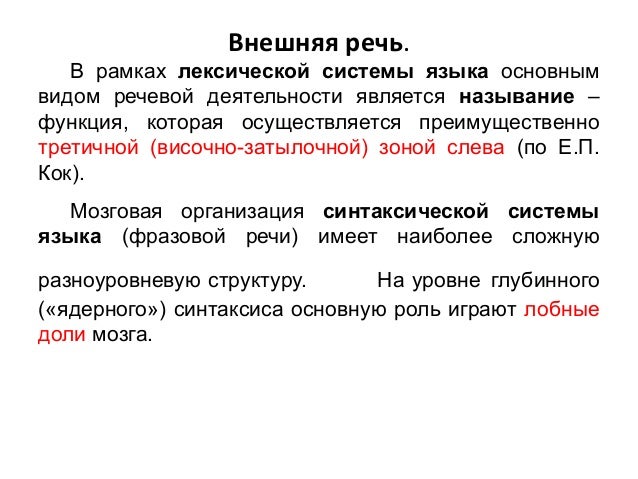 - 6. Внешняя речь. В рамках лексической системы языка основным видом речевой деятельности является называние – функция, которая осуществляется преимущественно третичной (височно-затылочной) зоной слева (по Е.П. Кок). Мозговая организация синтаксической системы языка (фразовой речи) имеет наиболее сложную разноуровневую структуру. На уровне глубинного («ядерного») синтаксиса основную роль играют лобные доли мозга.