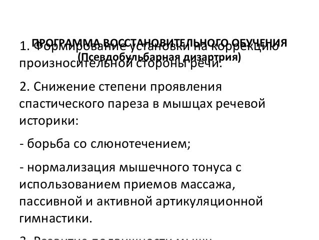 - 60. ПРОГРАММА ВОССТАНОВИТЕЛЬНОГО ОБУЧЕНИЯ (Псевдобульбарная дизартрия) 1. Формирование установки на коррекцию произносительной стороны речи. 2. Снижение степени проявления спастического пареза в мышцах речевой историки: борьба со слюнотечением; нормализация мышечного тонуса с использованием приемов массажа, пассивной и активной артикуляционной гимнастики.