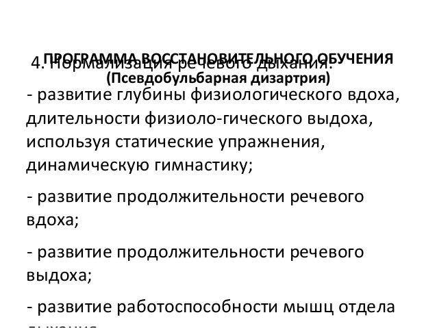 - 61. ПРОГРАММА ВОССТАНОВИТЕЛЬНОГО ОБУЧЕНИЯ (Псевдобульбарная дизартрия) 4. Нормализация речевого дыхания: развитие глубины физиологического вдоха, длительности физиологического выдоха, используя статические упражнения, динамическую гимнастику; развитие продолжительности речевого вдоха; развитие продолжительности речевого выдоха; развитие работоспособности мышц отдела