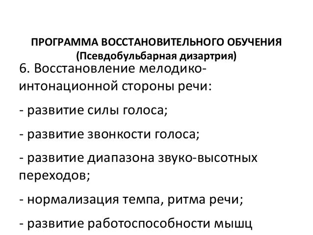- 62. ПРОГРАММА ВОССТАНОВИТЕЛЬНОГО ОБУЧЕНИЯ (Псевдобульбарная дизартрия) 6. Восстановление мелодико интонационной стороны речи: развитие силы голоса; развитие звонкости голоса; развитие диапазона звуковысотных переходов; нормализация темпа, ритма речи; развитие работоспособности мышц