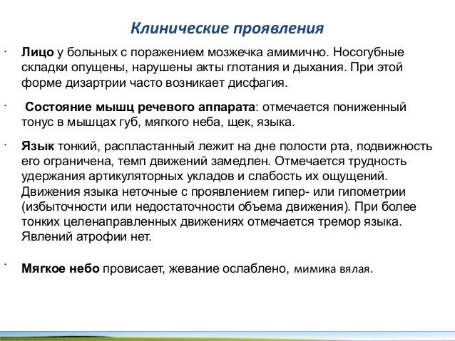 - 64. Клинические проявления • Лицо у больных с поражением мозжечка амимично. Носогубные складки опущены, нарушены акты глотания и дыхания. При этой форме дизартрии часто возникает дисфагия. • Состояние мышц речевого аппарата: отмечается пониженный тонус в мышцах губ, мягкого неба, щек, языка. • Язык тонкий, распластанный лежит на дне полости рта, подвижность его ограничена, темп движений замедлен. Отмечается трудность удержания артикуляторных укладов и слабость их ощущений. Движения языка неточные с проявлением гипер- или гипометрии (избыточности или недостаточности объема движения). При более тонких целенаправленных движениях отмечается тремор языка. Явлений атрофии нет. • Мягкое небо провисает, жевание ослаблено, мимика вялая.