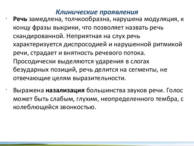 - 65. Клинические проявления • Речь замедлена, толчкообразна, нарушена модуляция, к концу фразы выкрики, что позволяет назвать речь скандированной. Неприятная на слух речь характеризуется диспросодией и нарушенной ритмикой речи, страдает и внятность речевого потока. Просодически выделяются ударения в слогах безударных позиций, речь делится на сегменты, не отвечающие целям выразительности. • Выражена назализация большинства звуков речи. Голос может быть слабым, глухим, неопределенного тембра, с колеблющейся звонкостью.