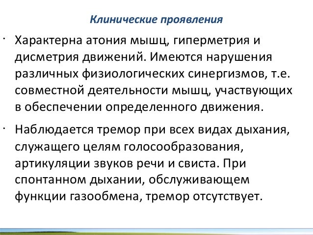 - 66. Клинические проявления • Характерна атония мышц, гиперметрия и дисметрия движений. Имеются нарушения различных физиологических синергизмов, т.е. совместной деятельности мышц, участвующих в обеспечении определенного движения. • Наблюдается тремор при всех видах дыхания, служащего целям голосообразования, артикуляции звуков речи и свиста. При спонтанном дыхании, обслуживающем функции газообмена, тремор отсутствует.