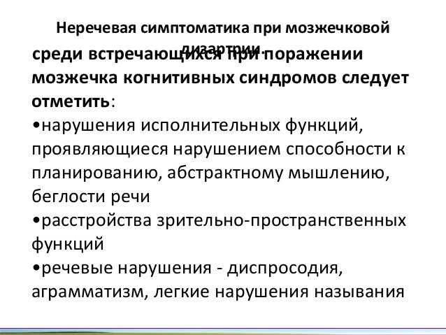 - 69. Неречевая симптоматика при мозжечковой дизартрии.среди встречающихся при поражении мозжечка когнитивных синдромов следует отметить: •нарушения исполнительных функций, проявляющиеся нарушением способности к планированию, абстрактному мышлению, беглости речи •расстройства зрительнопространственных функций •речевые нарушения диспросодия, аграмматизм, легкие нарушения называния