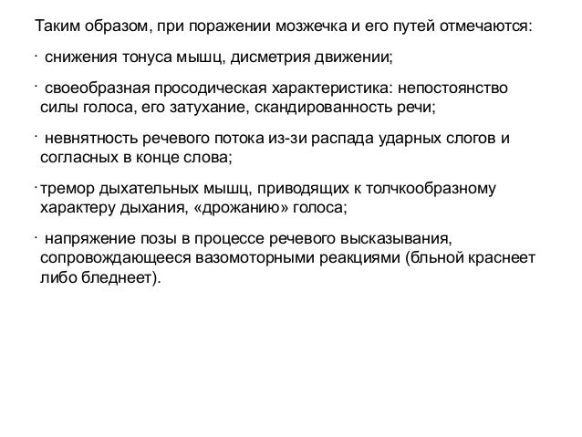 - 68. Неречевая симптоматика при мозжечковой дизартрии.у пациентов с мозжечковым поражением нередко отмечаются: •снижение внимания и замедленность мышления •в настоящее время имеются данные, свидетельствующие о роли мозжечка и его связей в осуществлении когнитивных и эмоциональноаффективных функций, что не связано с собственно мозжечковым двигательным дефектом •наиболее значительные когнитивные расстройства возникают при поражении задних отделов и червя мозжечка, особенно при его остром поражении, например, в острую фазу инсульта •в существенно меньшей степени когнитивные и эмоциональные расстройства выражены по завершении острой фазы заболевания, например, через 3–4 месяцев от начала инсульта и при медленно нарастающем и ограниченном по своим размерам мозжечковом поражении.