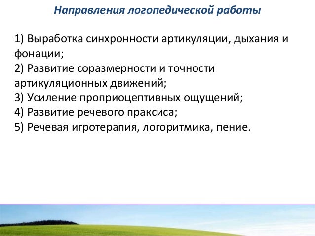 - 71. Направления логопедической работы 1) Выработка синхронности артикуляции, дыхания и фонации; 2) Развитие соразмерности и точности артикуляционных движений; 3) Усиление проприоцептивных ощущений; 4) Развитие речевого праксиса; 5) Речевая игротерапия, логоритмика, пение.