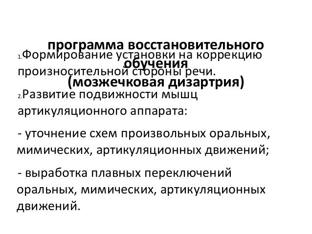 - 72. программа восстановительного обучения (мозжечковая дизартрия) 1.Формирование установки на коррекцию произносительной стороны речи. 2.Развитие подвижности мышц артикуляционного аппарата: уточнение схем произвольных оральных, мимических, артикуляционных движений; выработка плавных переключений оральных, мимических, артикуляционных движений.
