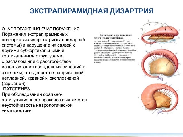 - 74. ЭКСТРАПИРАМИДНАЯ ДИЗАРТРИЯ ОЧАГ ПОРАЖЕНИЯ ОЧАГ ПОРАЖЕНИЯ Поражения экстрапирамидных подкорковых ядер (стриопаллидарной системы) и нарушение их связей с другими субкортикальными и кортикальными структурами. с распадом или с расстройством использования врожденных синергий в акте речи, что делает ее напряженной, неплавной, «рваной», эксплозивной (взрывной). ПАТОГЕНЕЗ. При обследовании орально- артикуляционного праксиса выявляется неустойчивость неврологической симптоматики.