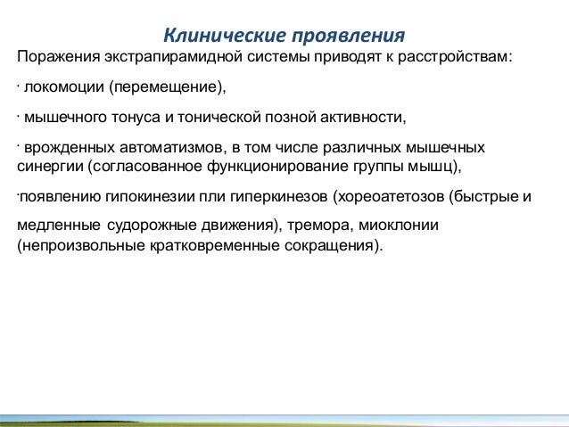 - 75. Клинические проявления Поражения экстрапирамидной системы приводят к расстройствам: • локомоции (перемещение), • мышечного тонуса и тонической позной активности, • врожденных автоматизмов, в том числе различных мышечных синергии (согласованное функционирование группы мышц), • появлению гипокинезии пли гиперкинезов (хореоатетозов (быстрые и медленные судорожные движения), тремора, миоклонии (непроизвольные кратковременные сокращения).