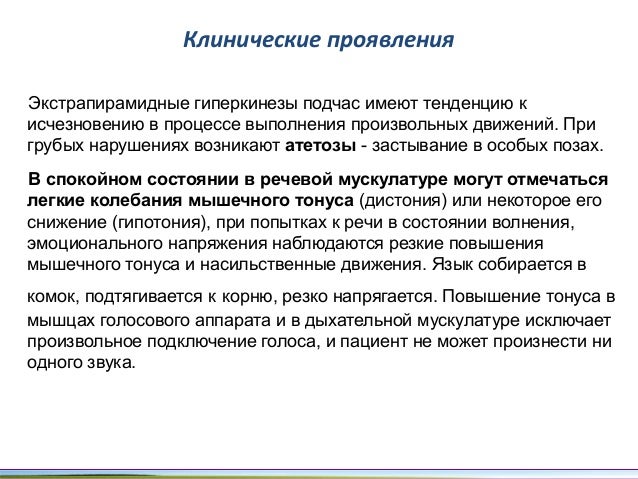 - 76. Клинические проявления Экстрапирамидные гиперкинезы подчас имеют тенденцию к исчезновению в процессе выполнения произвольных движений. При грубых нарушениях возникают атетозы - застывание в особых позах. В спокойном состоянии в речевой мускулатуре могут отмечаться легкие колебания мышечного тонуса (дистония) или некоторое его снижение (гипотония), при попытках к речи в состоянии волнения, эмоционального напряжения наблюдаются резкие повышения мышечного тонуса и насильственные движения. Язык собирается в комок, подтягивается к корню, резко напрягается. Повышение тонуса в мышцах голосового аппарата и в дыхательной мускулатуре исключает произвольное подключение голоса, и пациент не может произнести ни одного звука.