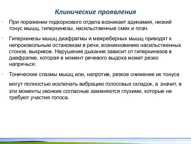 - 77. Клинические проявления • При поражении подкоркового отдела возникает адинамия, низкий тонус мышц, гиперкинезы, насильственные смех и плач. • Гиперкинезы мышц диафрагмы и межреберных мышц приводят к непроизвольным остановкам в речи, возникновению насильственных стонов, выкриков. Нарушение дыхания зависит от гиперкинезов в диафрагме, которая в момент речевого выдоха может резко напрячься. • Тонические спазмы мышц или, напротив, резкое снижение их тонуса могут полностью исключать вибрацию голосовых складок, а значит, в эти моменты звонкие согласные заменяются глухими, которые не требуют участия голоса.